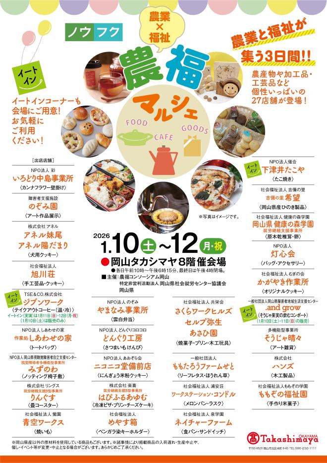 2026年1月10日(土)〜12日(月)までの3日間、岡山高島屋8階催会場にて農福マルシェが開催されます。そうじゃ晴々もアート雑貨を会場で販売します!